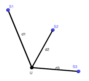 d = \sqrt{(a_1-b_1)^2 +(a_2-b_2)^2+(a_3-b_3)^2}Thus, the position is defined by a system of equations, with as many equations as coordinates
